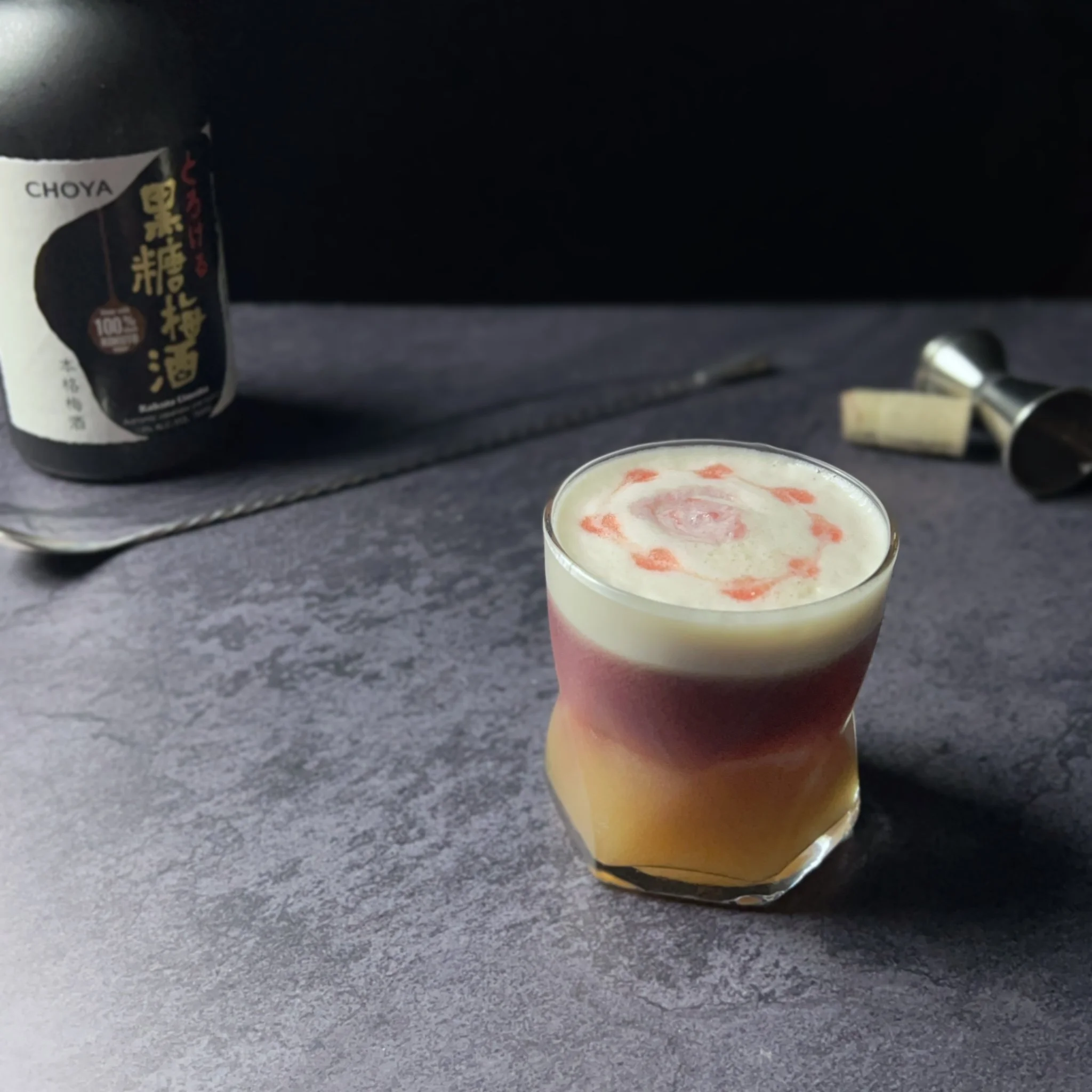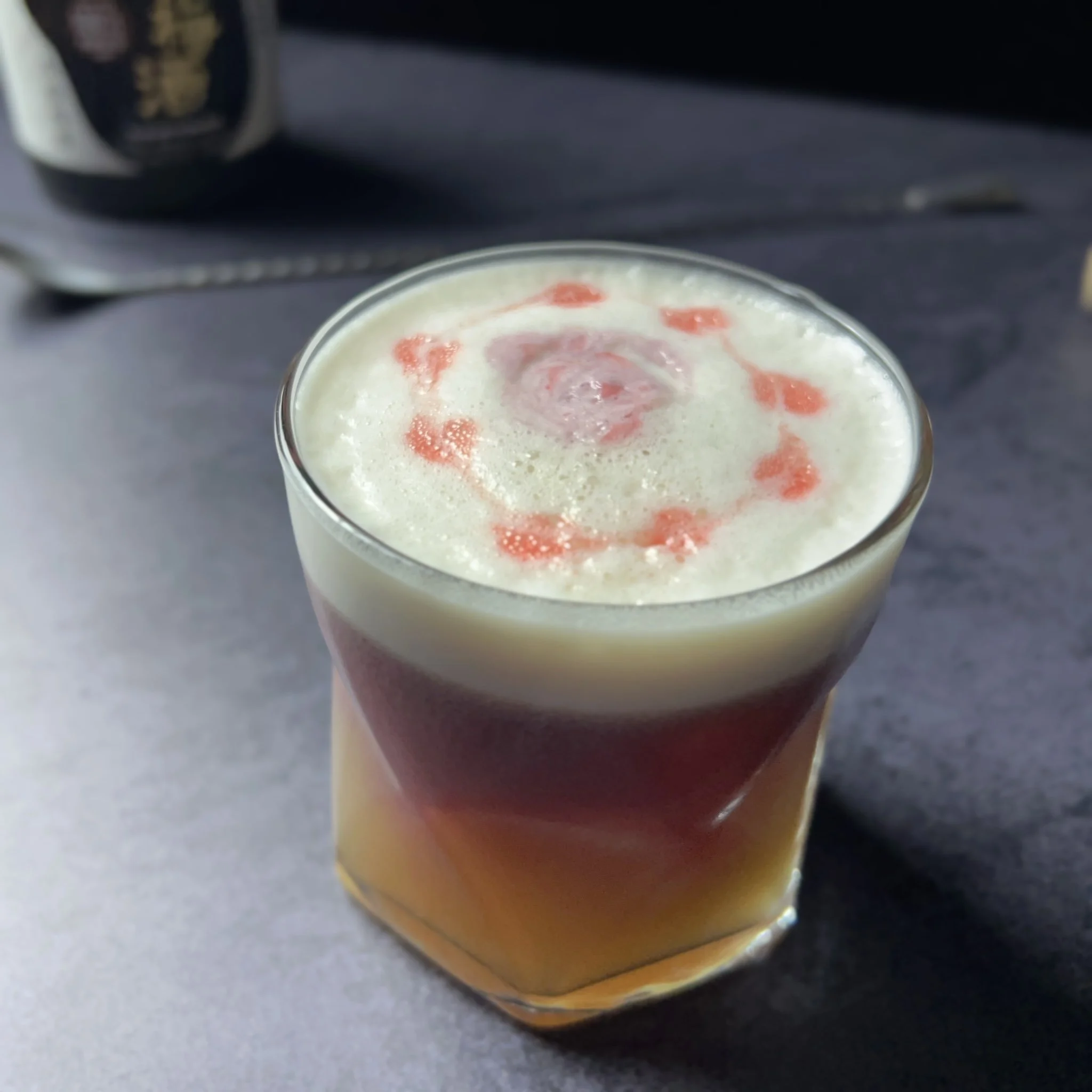 This drink doesn’t have any rum (that will be my next round of experimenting); instead, this one lives somewhere between a pisco sour and a NY sour. Pisco’s funkiness works beautifully, but 2oz was overpowering so I split the base with gin. This helped highlight more of the fruity/floral qualities of the umeshu. The red wine helps to round the whole thing out with the dry tannins serving as a necessary balancing measure. It’s a really tasty sip!