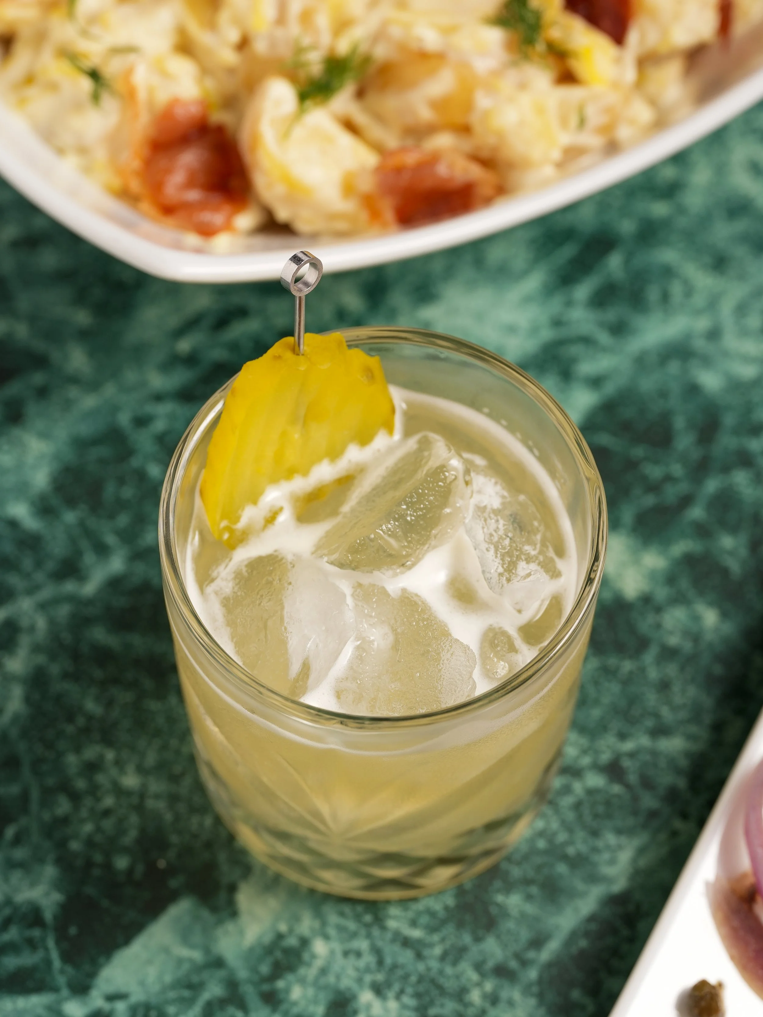 Shake, strain over fresh ice, garnish with a pickle. Cheers!!