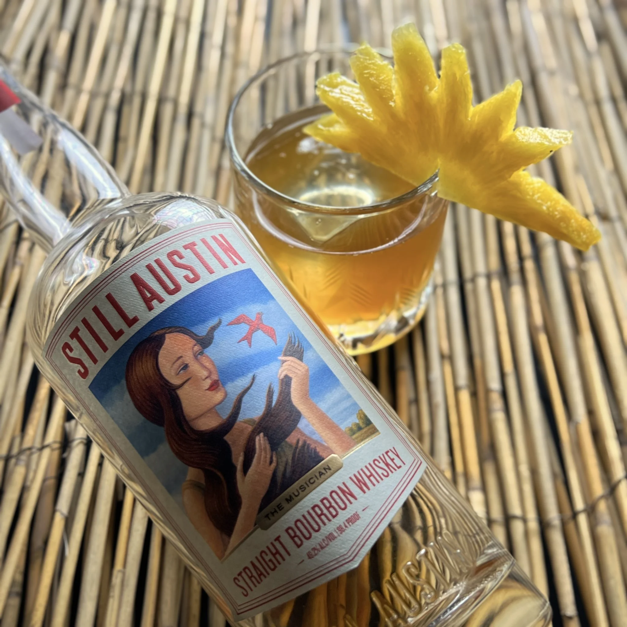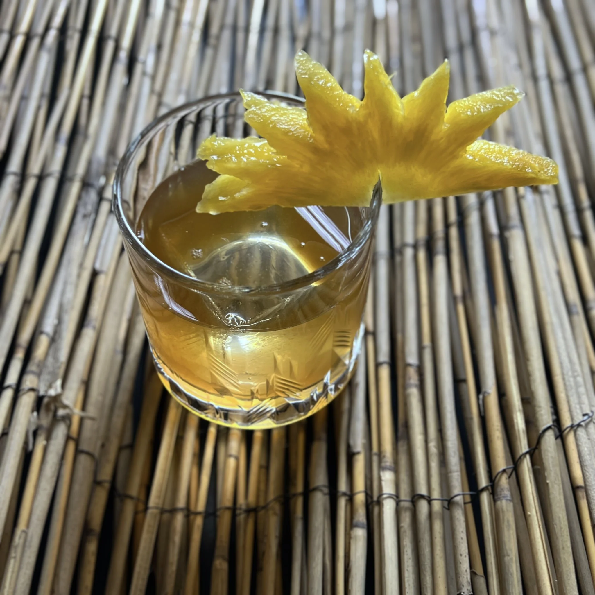 The drink is an old fashioned riff with fresh juice. This isn't a mistake, nor is it without precedent. @punch_drink actually published an article (3/4/22) describing the phenomenon. In general, it works best when the juice is a small proportion compared to the entire drink. Here, a bit of fresh pineapple juice gives a huge burst of pineapple flavor and a bit of brightness, while still allowing the bourbon to be front and center. The touch of rum adds to the tropical flavor and helps integrate the sherry. It's a tasty one, so give it a go, especially if you've never stirred with juice!