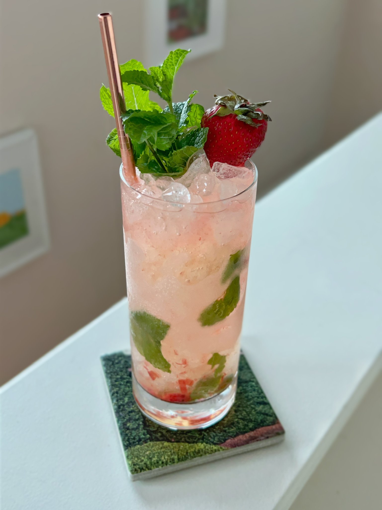 The build uses an atypical source of fizz, tepache (fermented pineapple beverage). On vacation I used a purchased tepache (awesome grocery store find), but for the shoot at home, I made my own (it's super easy, fun, and really tasty!). I lengthened the drink further with coconut water, which adds a hint more of tropical depth. Strawberry (in the form of jam) takes co-lead here with the pineapple and the mint really ties the whole thing together. The gin works perfectly here, straddling the line between tropical and more of a typical gimlet/southside build (seriously, gin is so versatile).